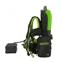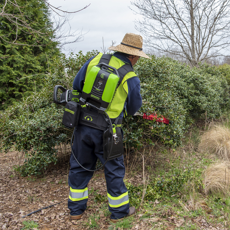 Potente batería portátil de 82V empaquetada en un cómodo arnés de diseño personalizado que transfiere la energía a cualquier herramienta de la línea profesional de Greenworks Commercial 82V, cuando se usa con la batería de transferencia.