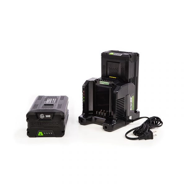 Compatible con todas las baterías de iones de litio Greenworks de 82V. Su ventilador incorporado mantiene la temperatura de la batería, lo que prolonga la vida útil de la misma. El indicador con luz LED comunica el estado de la carga.